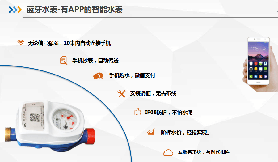 蓝牙低水表具有成本低廉、安装维护简便、防护等级高、可靠耐用、电池寿命长、用户操作方便、支持手机APP等技术特点。 用户直接通过手机,就可以进行抄表、充值、操作。